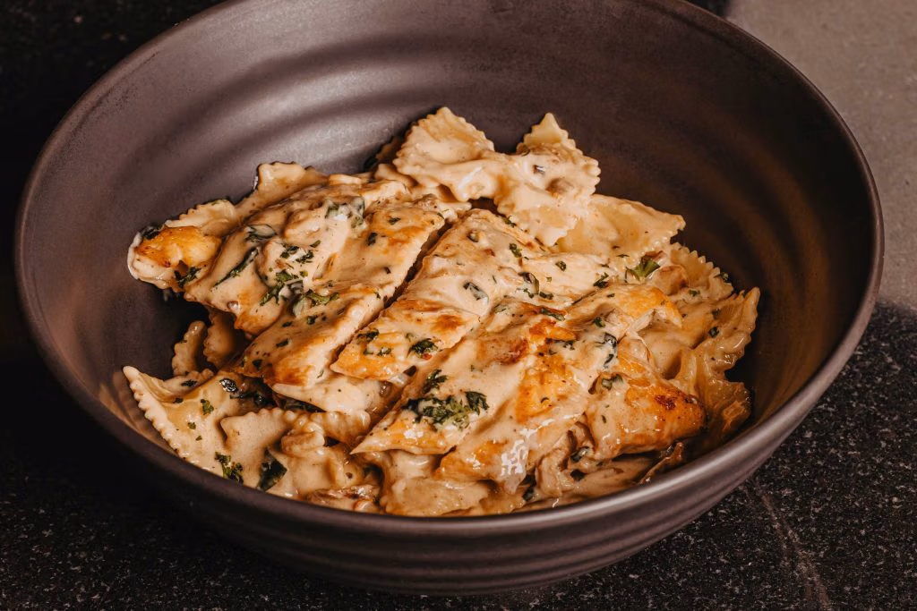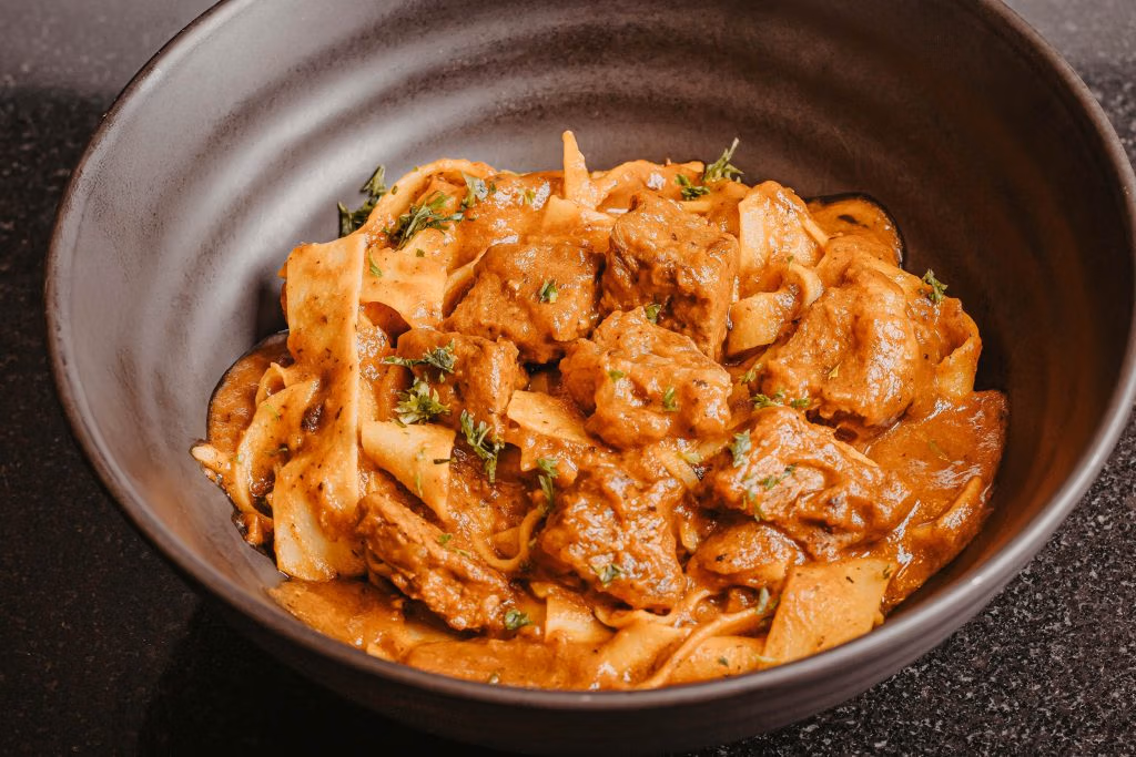 Thin striploin slices cooked in aromatic beef broth with brandy and spices